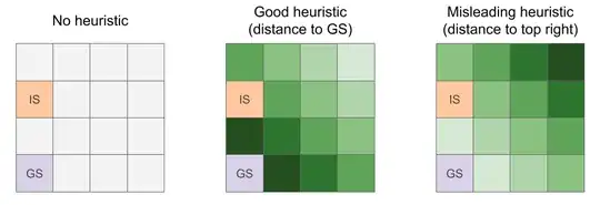 I drew a dumb example to illustrate my point. You want to reach from the Initial State (IS) to the Goal State (GS). The shade of green indicates the value of the heuristic (the greener the better).