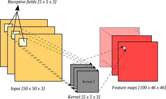 In the illustration above, a feature map is a 2-dimensional matrix of shape $46 \times 46$. There are $100$ feature maps (so $100$ kernels were convolved with the input image). The receptive field of a neuron (small pink square in the feature map) is a 3-dimensional sub-region of the image of shape $5 \times 5 \times 3$. Note that, in this case of a 2d-convolution, the kernel has the same depth as the input image (i.e. $3$).