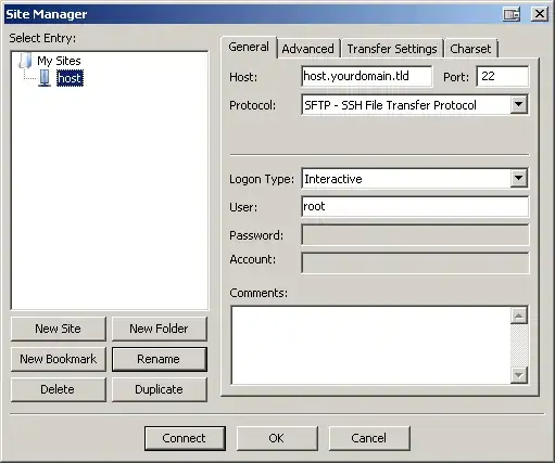 - Finally, on the left side of the Site Manager, click on the New Site button and type a unique name under My Sites that will allow you to easily identify this particular remote server in the future.