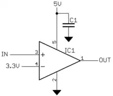 This will create about a 50 mV hystersis band. For example, when the input goes high so that the output goes high, the input has to go 50 mV lower before the output will go low. The hystesis band will be a little assymetric due to your threshold of 3.3 V not being in the middle of the output. This can be compensated for several ways, including adjusting the reference voltage fed into the negative input. Let me know if you want to get into those details.