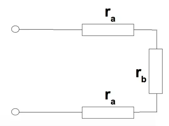 This section has resistance \$ R_1 = 2r_a + r_b \$. I then considered adding another loop to this as essentially adding another resistor \$R_1\$ in parallel to the first loop, so this would have resistance $$\frac{1}{R_2} = \frac{1}{R_1} + \frac{1}{R_1} $$ so $$R_2 = \frac{2r_a + r_b}{2}$$