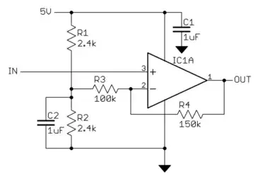 In addition to @Bradman175's comments, note that if you are using +5 VDC to power your op amp, the op amp's output voltage will never reach +5 VDC. Components in the op amp's output stage will always drop some of the +5 VDC power supply voltage, thereby preventing the voltage at OUT from swinging all the way up to +5 VDC, or all the way down to zero volts. – Jim Fischer Jun 17 '16 at 23:20