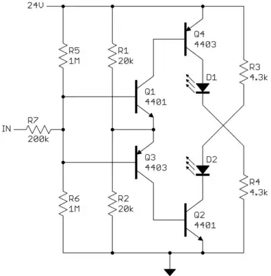 • When input is at 0V level, I want the first LED to emit light. When the input is at +24V level, I want the second LED to emit light. When the input is unconnected (left open), I do not the LEDS to emit light.