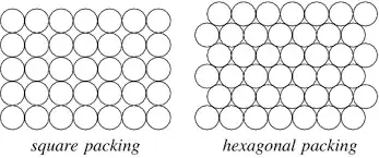 A triangular tiling would allow π⁄√12 or 90.69% of the footprint to be reserved for the solder balls and the surrounding clearance, while the ubiquitous square tiling only allows π/4 or 78.54% of the footprint to be used.