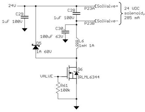 In this case, I added a deliberate inductor, even though the load is sufficiently inductive to smooth out the individual pulses. The reason for L6 and C30 is to filter the voltage swings on the SolValve- wire. Without these two components, that wire would carry the full switching pulses. That would cause a lot of RF emissions.