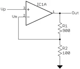 But wait.  Before we call it a day and congratulate ourselves for having solved all the world's problems, remember where that 10 came from.  That was from the voltage divider value.  Our overall circuit gain is controlled by that voltage divider.  In fact, it is 1 over the fraction of the output fed back into the input.  Let's call that fraction F, the feedback fraction, which is 1/10 in this example.  Going back to the last equation, the overall circuit gain will be basically 1/F as long as that is small compared to G.  So what if we needed a overall gain of 2?  What could we change to get that?  Yes, we could make R1 100Ω, or R2 900Ω.  In fact as long as R1 and R2 are equal, the voltage divider will divide by 2, F will be 1/2, and the overall circuit gain therefore 2.  (This is probably not the time to get into limits of R1 and R2 due to opamp drive capability and the like.  Let them bask in their accomplishment today and get into limitations tomorrow).