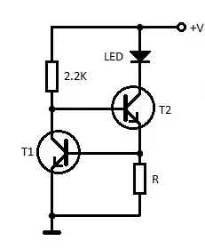 To maintain a constant current through the LED means the transistor T2 to maintain a constant voltage across the resistor R. We see the voltage VR is compared with T1 threshold voltage of 0.7 V and amplified by T1 that controls T2 so as to keep VR constant. For example, if the LED current decreases for some reason, VR decreases as well. T1 increases its collector voltage and T2 increases the LED current. Yeah, sure... that is the great principle of negative feedback.