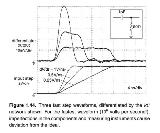 I'm reading AoE, there is a figure (p.26) for RC differentiator output and input voltages for step 5V input voltage with different slew rates (\$dV_{in}/dt\$). (It's time domain part. Only the rising edge of a step is shown.)