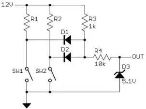 Again, R1, R2, SW1, and SW2 are the switches and loads that you presumably can't get into. This requires breaking the power connection to the loads and inserting R3, R4, and Q1. R3 is a current sense resistor sized to produce enough of a voltage drop to turn on Q1 when either of the loads is on. R4 is just to limit current thru the base of Q1 to safe levels.