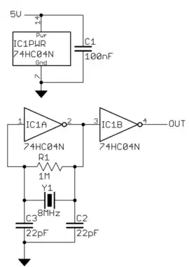 In this example, there are 4 more inverters in the same package. You can use them in other ways, but make sure they are not left floating. If you need a lot of drive, for example, you could drive the remaining 4 inverters from the output of IC1B, which then gives you 4 nearly equal CMOS outputs producing the same clock signal. Tie the inputs to any unused inverters to ground.