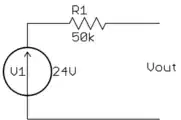 Now it should be obvious what happens as the source is loaded. It will be 24 V with 0 current. Any current drawn will also flow thru R1, which causes a voltage drop accross R1, which subtracts from the 24 V source voltage as seen by the output. This relationship is linear. We already have the point with 0 current. Another point that gives us some intuition is the 0 voltage case. If you short Vout, all the voltage will be accross R1. By Ohms law, the current thru R1 is 24 V / 50 kΩ = 480 µA. Therefore as the current drawn from Vout varies from 0 to 480 µA, the Vout voltage vary linearly from 24 V to 0.
