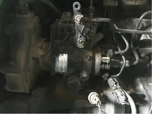 This absolutely is the high pressure fuel injection pump for the diesel engine. I cannot tell for sure, but it looks as though this is a three cylinder engine (?) as I can only see two fuel lines coming out the right side of the injector pump. I'm assuming the third one is on the back side of this, behind the fuel line coming from the fuel tank (larger line in the middle). (NOTE: Actually, now that I'm looking closer, I can see the three lines which are linked together on the side of the block going upwards away from the pump.)