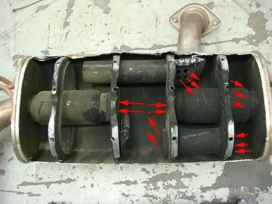 The image below is a cutout of a typical muffler. You can see the exhaust gasses and sound waves will enter (on the left) and exit (out the top). The baffling allows the exhaust to travel the path of least resistance (once pressure has built), while forcing the sound waves to bounce around through the various tubes and chambers, thus canceling the desired frequencies. The volume of the sound baffling chambers is why mufflers are as large as they are.