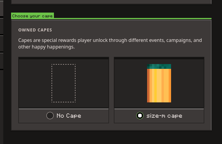 A cape that has similar color palette to the sniffer has been found on Mojang's staging texture server and on Mojang's production texture server. It was added to Mojang's staging texture server on October 10, 2023 and added to Mojang's production texture server 7 days later on October 17, 2023. The cape was first seen on 2 accounts on Mojang's staging server database. | |