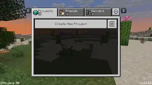Using the tool starts with creating a new Project. New projects can be created from the main menu. This menu uses a similar layout to Bedrock Edition's World Selection Menu, with the option to exit being replaced with a link to the Settings menu. The Worlds tab is replaced with the Projects tab. "Create New" is changed to "Create New Project", and the Realms promotion below is missing. The Friends and Servers tabs are also available. Within the Project Creation menu, most options available in Bedrock Edition Preview's world creation remain.