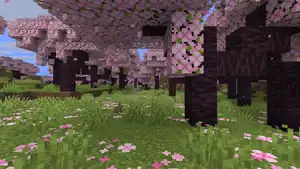 Cherry groves are grasslands with a lot of short grass, tall grass and, instead of the traditional dandelion and poppy flowers, the ground is covered with pink petals. The main environmental feature of the cherry grove are cherry trees identified by their striking pink color. The cherry trees may generate densely enough to create a cover of leaves. Sheep, pigs and rabbits are the only passive mobs that spawn in this biome. |