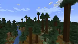Comparison of old growth pine taiga and old growth spruce taiga biomes. Note how the giant spruce trees are much thicker. -