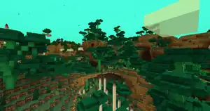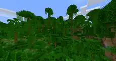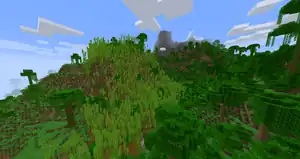 A dense forested biome that includes many different plants and features. Jungle trees and mega jungle trees are common, with the mega trees having 2x2 thick trunks and possibly growing up to 31 blocks in height. Fancy oak trees are also common, and jungle bushes often cover much of the forest floor. Ferns and large ferns are found commonly, and vines are found growing on most types of blocks, especially on jungle trees. Additionally, cocoa can also grow on the sides of jungle trees. Melons can generate here in patches, similar to pumpkins, although they are much more common. Single shoots of bamboo can be found scattered throughout the biome. The foliage in the jungle is a bright, lush green color. Jungle pyramids and trail ruins can generate, and ocelots, parrots, pandas and warm animal variants can spawn in this biome. |
