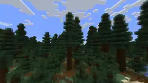 A biome covered by a forest of spruce trees. Ferns, large ferns and sweet berry bushes grow commonly on the forest floor. One can find packs of wolves here, along with small groups of foxes, rabbits or cold animal variants. Villages may generate in this biome; the houses in these villages are built with spruce wood. Pillager outposts may also generate in this biome. This is one of the few biomes where trail ruins can generate. |