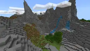 One of the three biomes that generate in the peaks of a mountain. This biome is found in taller and more jagged and pointy peaks that often pass the clouds and can peak at Y=256. It is covered by a single layer of snow blocks with stone underneath often exposing ores such as coal, iron and emerald. Just like the snowy slopes, stone cliffs can generate in some sides of the mountain. Goats spawn in this biome. Polar bears and rabbits may also spawn here and strays appear at night or during thunderstorms. |