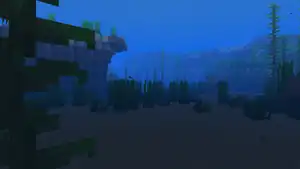 A biome characterized by a dense foliage, featuring plenty of mangrove trees of varying heights. The floor is mainly composed of mud blocks with occasional grass patches. The grass has the same color as in the normal swamp but leaves and vines have a unique light green tint and the water is teal rather than gray. Frogs often spawn in this biome and all frogs spawned here are warm frogs. Slimes also spawn naturally at night and during thunderstorms, most commonly on full moons. Some zombies may end up underwater, which can transform them into drowned, and some skeletons are replaced by boggeds, making this an especially dangerous biome at night or thunderstorms. Visibility is also lower than other biomes when the player is underwater. |