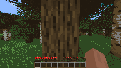 By holding down the destroy button while looking at a block within range, the player's hand begins swinging, making a repetitive "thump" sound as the player hits the block. Cracks appear on the block, which show that it is being broken.