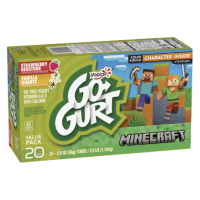Minecraft Go-Gurt is a licensed product featuring Minecraft and the yogurt brand Go-Gurt, an on-the-go style children's low-fat yogurt snack. Available in three flavors, the Go-Gurt is designed to be sucked out from a plastic pouch.