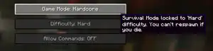 When creating a Hardcore mode world, the Allow Commands, Starting Map, and Bonus Chest world options are locked and disabled. On the world selection menu, Hardcore mode worlds display dark red text reading "Hardcore Mode!"