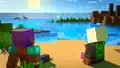 After arriving at a beach and bumping into a disappearing horse, the classic player asks if "this was all part of Mojang's plan." They are told no in a condescending manner, before another time traveler voiced by Jens Bergensten emerges from the sand to propose showing the two the future.