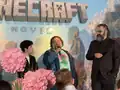 The step and repeat banner had featured an Overworld backdrop with a bee and the movie's logo at the center top. Around where the person stands are life-sized models of the pink sheep and creeper from the movie which were surrounded by grass blocks and cubic plants and vegetation.