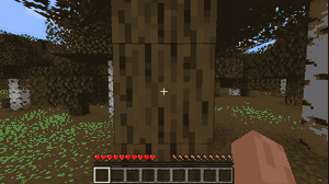 To start, find a nearby tree. Punch a log until it breaks and turns into an item. It should enter your inventory. Do that for the entire tree. Do not leave any trees floating.