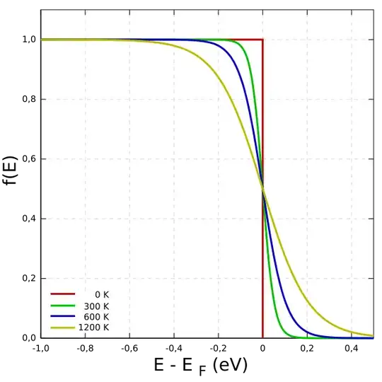First you must know that only electrons with an energy close to the Fermi energy can participate to the conduction process. Why? I mentioned earlier that at $T = 0$, the Fermi energy is a sharp line. At $T > 0$, this sharp line gets “washed out” and you get something like this: