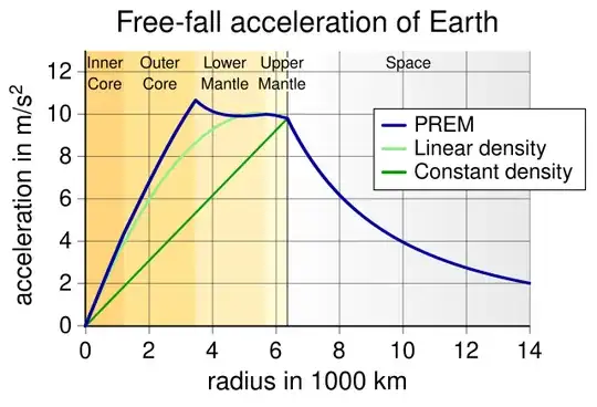 Finally, here's a graph of gravitational acceleration above and inside the Earth.