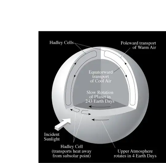Both Earth and Venus have a Hadley cell, a cell that moves cool air toward the equator (surface level) and warm air from the equator poleward (from above). The Earth's Hadley cell can't sustain itself all the way to the poles because of the Coriolis effect. Venus's Hadley cell also falters poleward, but not as strongly as does Earth's.