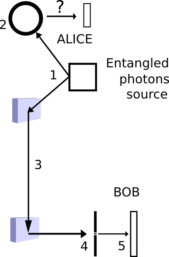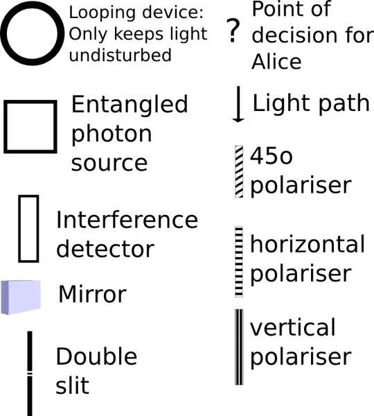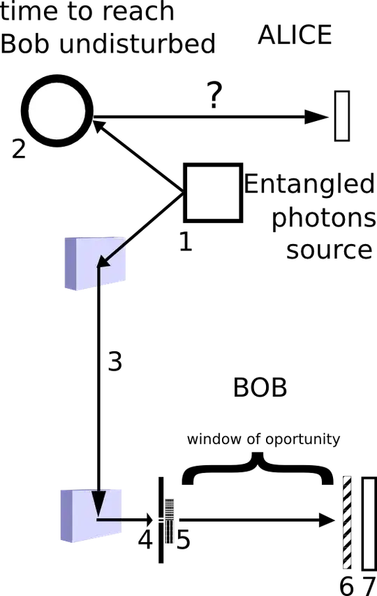 - Alice keeps her photons undisturbed in some way, could be a mirror in the middle of the path towards Bob. In the diagram I represented it as a "looping device"...