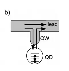 That means, then, that if you send an electron in from the left, there is some probability amplitude for it to tunnel out into the quantum dot, hang out there for a while, and then tunnel back in and keep going to the right; moreover, this process will add coherently with the simple propagation that just goes straight through, and the two can interfere both constructively and destructively, making for a more complicated (Fano) lineshape in the conductance.