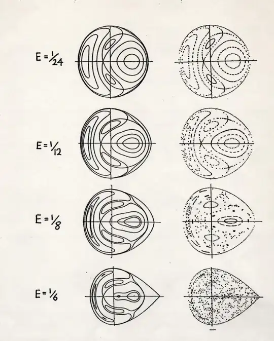 $\uparrow$ Fig. 1. Poincare maps in the $(y,\dot{y})$ plane with $(x,\dot{x})=(0,0)$ for various fixed energy-levels $E$ of the Henon-Heiles (HH) system. We consider below the outermost periodic orbit for $E=1/6$ and $E=1/12$.