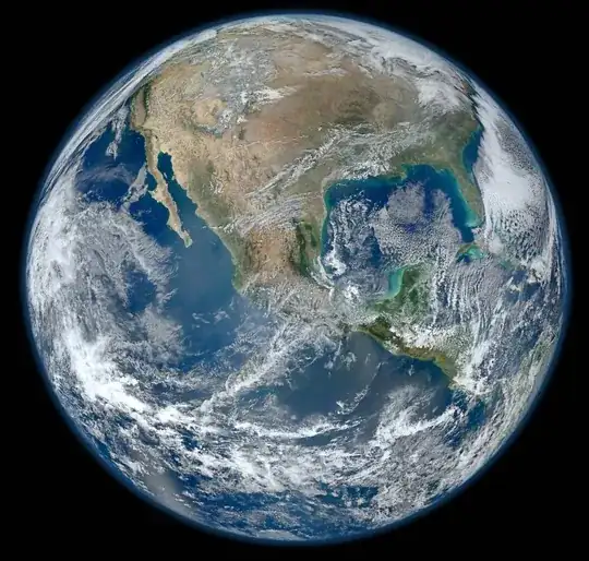 (That said, the first image is, in fact, a very carefully reconstructed mosaic that is made from images taken at much lower altitudes, in a painstaking process that is explained in detail in this Earth Observatory post. It's important to emphasize that, from whatever altitude Simmon simulated, this is indeed the continental layout that you would observe with your naked eye. The original posting of this image clearly identifies it as a mosaic: NASA is always very careful to precisely label every image it publishes in a correct fashion.)