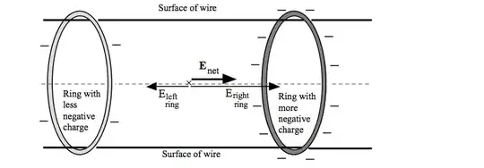 This continues all the way down the circuit to the positive side of the battery, each ring being a little less electron packed than the ring behind, until you get to the positive side, where there are almost no electrons on the edge, but also an equal amount of electrons and protons inside of the wire, with the electrons making their way forwards towards the part that seems like its even less crowded with electrons. If there wasn't an equal amount, these electrons would feel local electric fields and get shot off in random directions, and we already saw how that turned out, with electrons only on the surface of the wire.