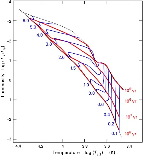 For higher mass systems, however, the contraction happens too fast, the temperature in the core becomes so hot that a radiative zone develops, and convection becomes inefficient and surplus energy is trapped in the system. As it contracts, the temperature therefore rises steeply, and the surface brightness rises with it. This is partly or completely cancelled by the shrinking surface area, meaning that the total luminosity stays roughly unchanged or growing slightly, but the temperature rises steeply. This is seen as a more or less horizontal track going right-to-left in the diagram; these are called Heyney Tracks