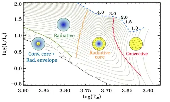 Here, the isochrones are gone, but the diagram is separated into regions corresponding to four different scenarios: Fully convective, fully radiative, Radiative core with convective outer layers, and convective core with radiative outer layers. All stars with $M \leq 3.5 M_{\odot}$ go through some phase with a convective core. All stars of $M \geq 1.5 M_{\odot}$ go through several phases, from possibly being fully convective, over having a radiative core and convective outer layers, over being fully radiative, to developing a convective core and radiative outer layers, before settling on the ZAMS.