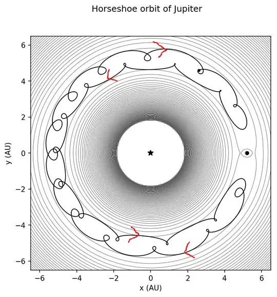 $\uparrow $ Fig. 1: A possible horseshoe orbit along equipotential lines.
