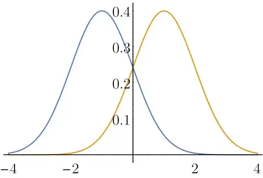 Let's call the wavefunctions of the first and second particles $\psi_A(x)$ and $\psi_B(x)$, respectively, and let us assume that their probability distributions have the form: