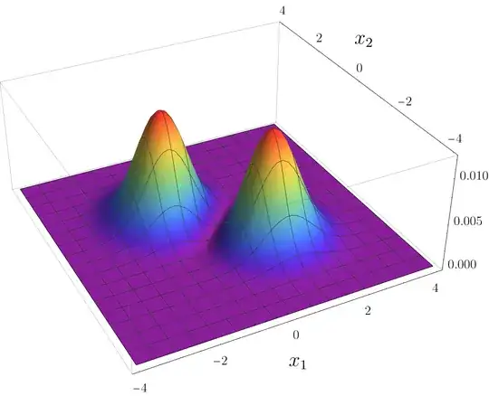 Plotting $\lvert\Psi(x_1,x_2)\rvert^2$ we get the following: