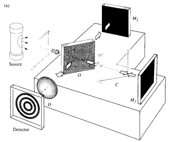 - Results from reflection of $B$ at the beam splitter $O$ towards mirror $M2$. Should there be a phase shift here? This is should be an air/(glass/metal coating) interface.