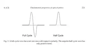 An interesting feature of a travelling electromagnetic wave is that it must have equal amounts of positive and negative field, meaning the shortest optical pulse that could be generated would be one full cycle. It is not possible to generate and transmit a unipolar electromagnetic pulse that consists of only 1/2 cycle. A plot of both cases is shown in fig. 3.
