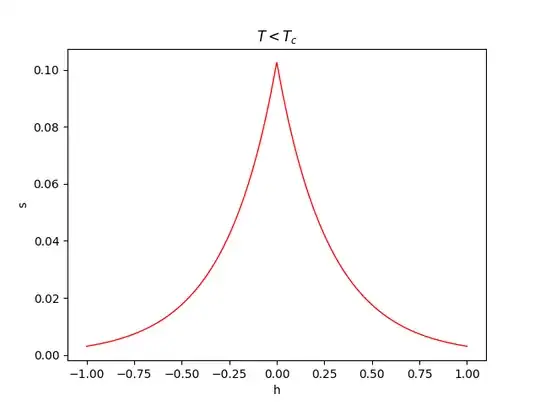 So, $ s(h) $ behaves non-analytically as $ -\frac{1}{|h|} $ in the vicinity of $ h = 0 $ (in the ordered phase when $ T < T_c $) (see figure below). This completes the picture of the discontinuous phase transition.