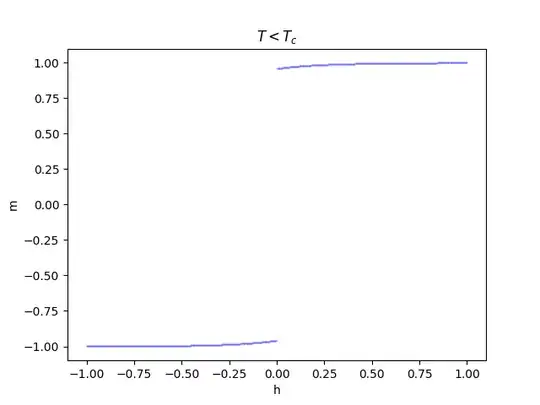 One may consider a variation of the first scenario where, at a fixed $ T < T_c $, the strength of the magnetic field is slowly (quasi-statically) varied from a positive value to some negative value. We observe that in this case, $ m $ has a jump at $ h = 0 $ (see figure below); therefore, a discontinuous (1st-order) phase transition happens when $ h $ crosses 0.