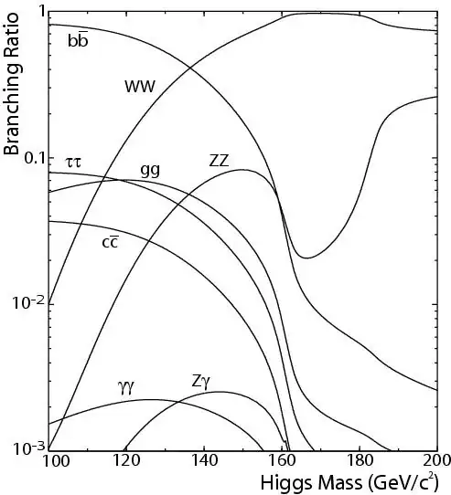 To illustrate this, here is a plot of the partial and total decay width (values taken from http://arxiv.org/abs/1307.1347 , Tables A.1-14):