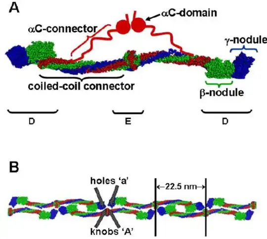 ((A) Model of human fibrinogen based on the crystal structure modified from [19]. (B) Model of half-staggered, double-stranded fibrin protofibril, illustrating the knob-hole interactions ‘A:a’. Because the locations of the αC regions in the protofibril are unknown, they are omitted from this model. (E) The model in panel C superimposed on a transmission electron micrograph of a negatively-stained fibrin fiber segment with alignment of the stain pattern with the assembled fiber pattern.)